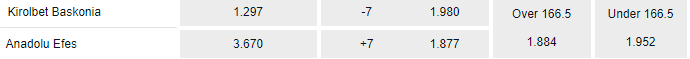 The most recent match up in this arena was won by Efes last season 79-81. In that game Efes were HUGE underdogs and covered a +14.5 Handicap and won the game despite being tipped at odds 9.00 to win. Total 170.5 points meanwhile ended with an Under as the teams totalled 160 points in that match up.